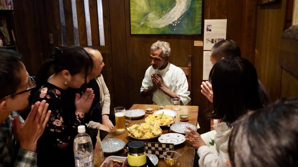 シェフのお師匠、アンディさん来日時の一コマ。お食事前のお祈りを捧げます。